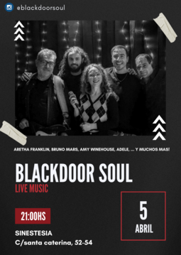 Enjoy an unforgettable night with BlackDoor's interpretation of your favorite Soul songs, featuring the stunning voice of Mònica Badia. It'll leave you speechless!