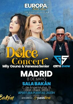La comedia y el entretenimiento llegan a Madrid con el Dolce Concert, un espectáculo irreverente y divertido protagonizado por Vanessa Senior y Milly Osuna, dos de las humoristas más queridas del público latino. La noche será aún más explosiva con la energía de GatoShow, la mejor hora loca de Estados Unidos, garantizando una fiesta sin igual. Risas, música y un ambiente inigualable en la sala Bakan. ¡No te lo pierdas!